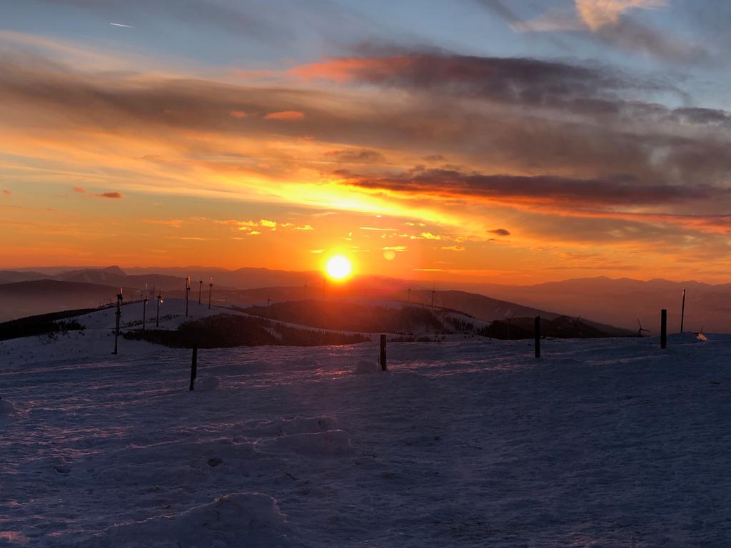 Am dick vereisten Gipfelkreuz angekommen, staunten wir über den nahezu kitschigen Sonnenuntergang im Westen und den Mondaufgang im Osten. Durch die beginnende Nacht bei wolkenlosem Himmel wurde es rasch merklich kälter, daher suchten wir Schutz im Güntherhaus und wärmten uns kurz bei einem Getränk auf. Die Abfahrt bei Vollmond führte uns über die Forststraße hinunter zu den Autos. Leider konnten wir auf Grund der Schneelage diesmal keinen Tiefschneehang befahren.